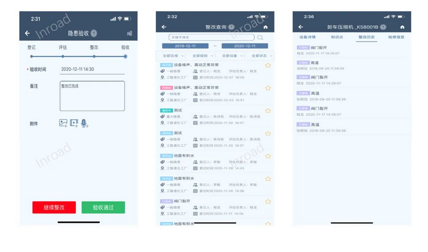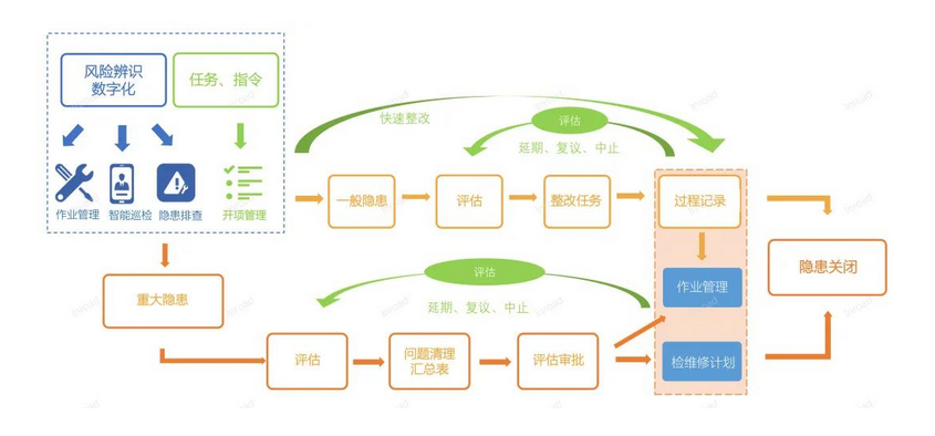 可以通過APP在線隨時(shí)隨地記錄、上傳隱患,具備專業(yè)的隱患評估矩陣,定性評估工具。隱患管理信息完整記錄,便于追溯,并且在整改過程支持創(chuàng)建作業(yè)票,整改超時(shí)可延期等。整個(gè)過程責(zé)任明確,節(jié)點(diǎn)清晰,進(jìn)度結(jié)果可跟蹤追溯,支持隨時(shí)按區(qū)域、時(shí)間、設(shè)備、級別等查詢整改狀況。