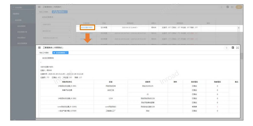 可制定安全巡查計(jì)劃,定期進(jìn)行隱患排查,并將風(fēng)險(xiǎn)管控措施加入隱患排查,保證風(fēng)險(xiǎn)可控,對發(fā)現(xiàn)的隱患隨上報(bào)、隨處理,解決傳統(tǒng)排查方式管理滯后,效率低的問題,同時(shí)隱患狀態(tài)與風(fēng)險(xiǎn)等級動態(tài)關(guān)聯(lián),四色圖實(shí)時(shí)反映現(xiàn)場安全狀態(tài)。主管部門可對安全巡查情況及時(shí)進(jìn)行跟蹤管理。