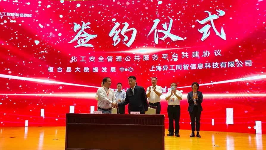 簽約儀式上,上海異工同智信息科技有限公司與桓臺縣大數(shù)據(jù)發(fā)展中心簽署共建協(xié)議,正式啟動化工安全管理公共服務(wù)平臺共建項目。