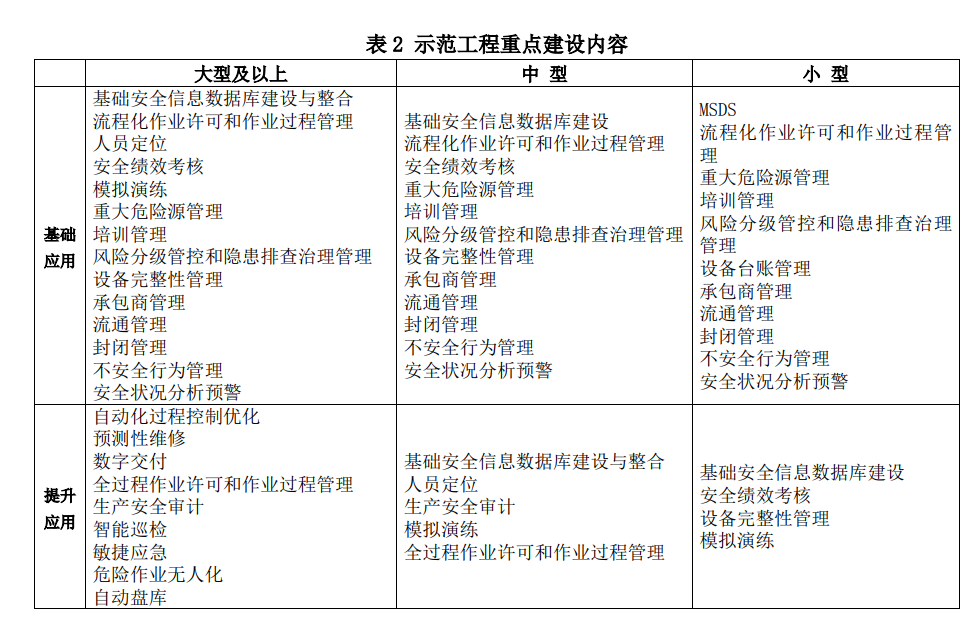本次方案一大亮點就是,從框架和內容上看,思路非常清晰,不僅對不同規模危化企業有不同的要求,而且還區分基礎應用和提升應用,并沒有出現過去簡單一刀切的做法。這點從方案最后一張“示范建設重點內容表”體現的尤其突出: