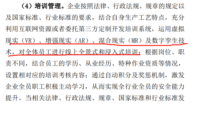 本次方案的另外一大亮點是,在方案中既有大量具體可落地的實用的內容:作業流程管理、隱患排查治理、風險分級管控、承包商管理、培訓管理…;又有大量的前瞻性的內容:工業互聯網標記與解析、5G、邊緣智能、虛擬現實(VR)、增強現實(AR)、混合現實(MR)及數字孿生技術、IoT電子鎖、作業無人化等等。這就是人們常說的“既腳踏實地,又抬頭看路”。以方案中一個模塊“培訓管理”為例,方案中就有相當多具體管理要求,又涵蓋了可以融合的新技術: