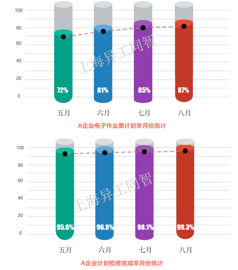 A企業5月份開始實施作業票電子化,作業票計劃率逐月上升,從72%上升到87%,提升15個百分點。計劃檢修完成率也相應提高。