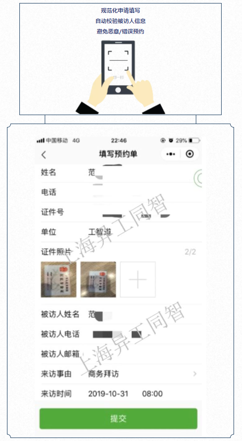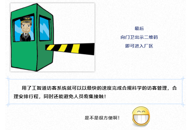 工智道訪客系統操作便捷,無需購買和安裝額外的設備及軟件,只需使用微信的掃一掃功能,即可查詢許可信息和出入放行登記。